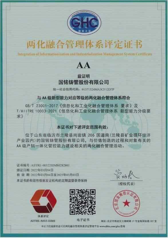 國銘鑄管股份有限公司是專注鑄管、鑄件領域研發(fā)、煉鐵、鑄造、銷售于一體的全產(chǎn)業(yè)鏈企業(yè),主營煉鐵和多品種離心球墨鑄鐵管,同時具有鑄造管件、鑄件、化工等輔助產(chǎn)品